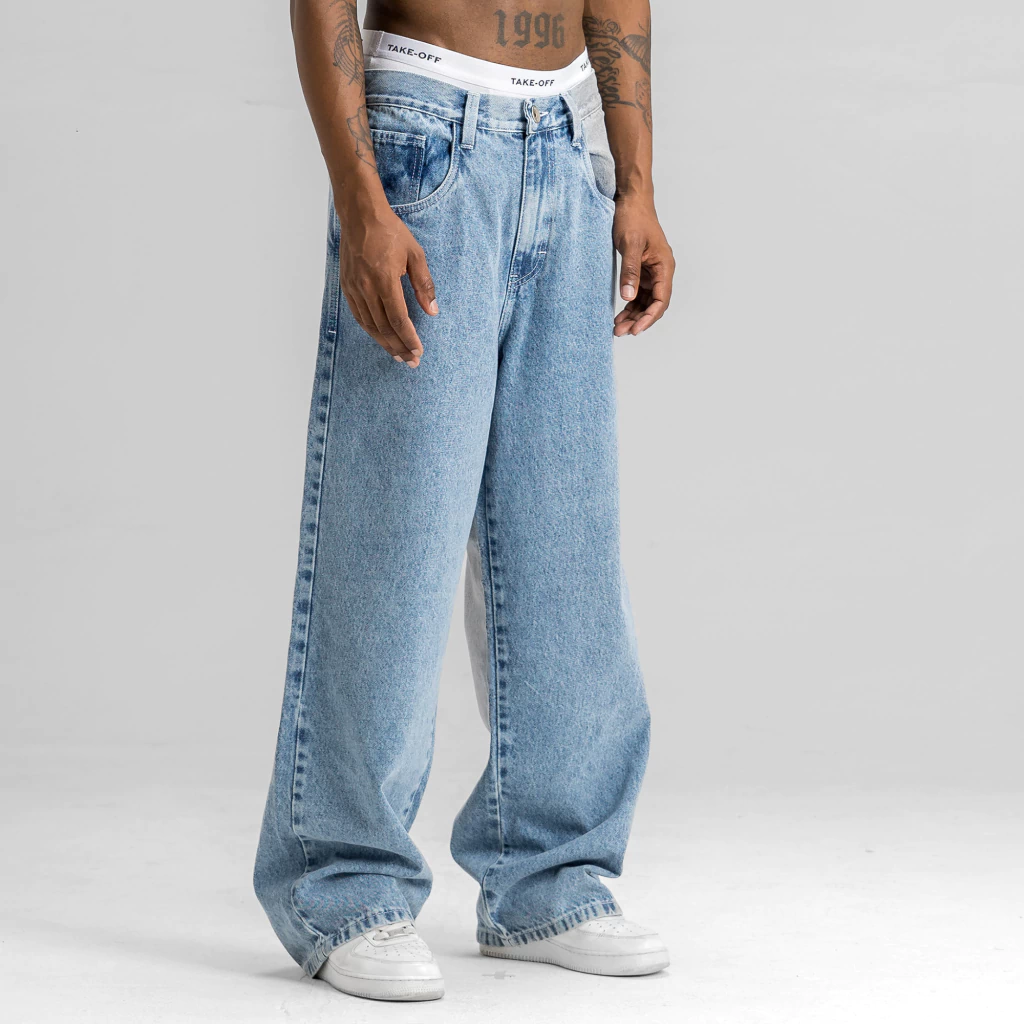 Marble Baggy Jeans conta com uma lavagem mais clara, tem bordado em um dos bolsos e aplicação de tag externa em couro.