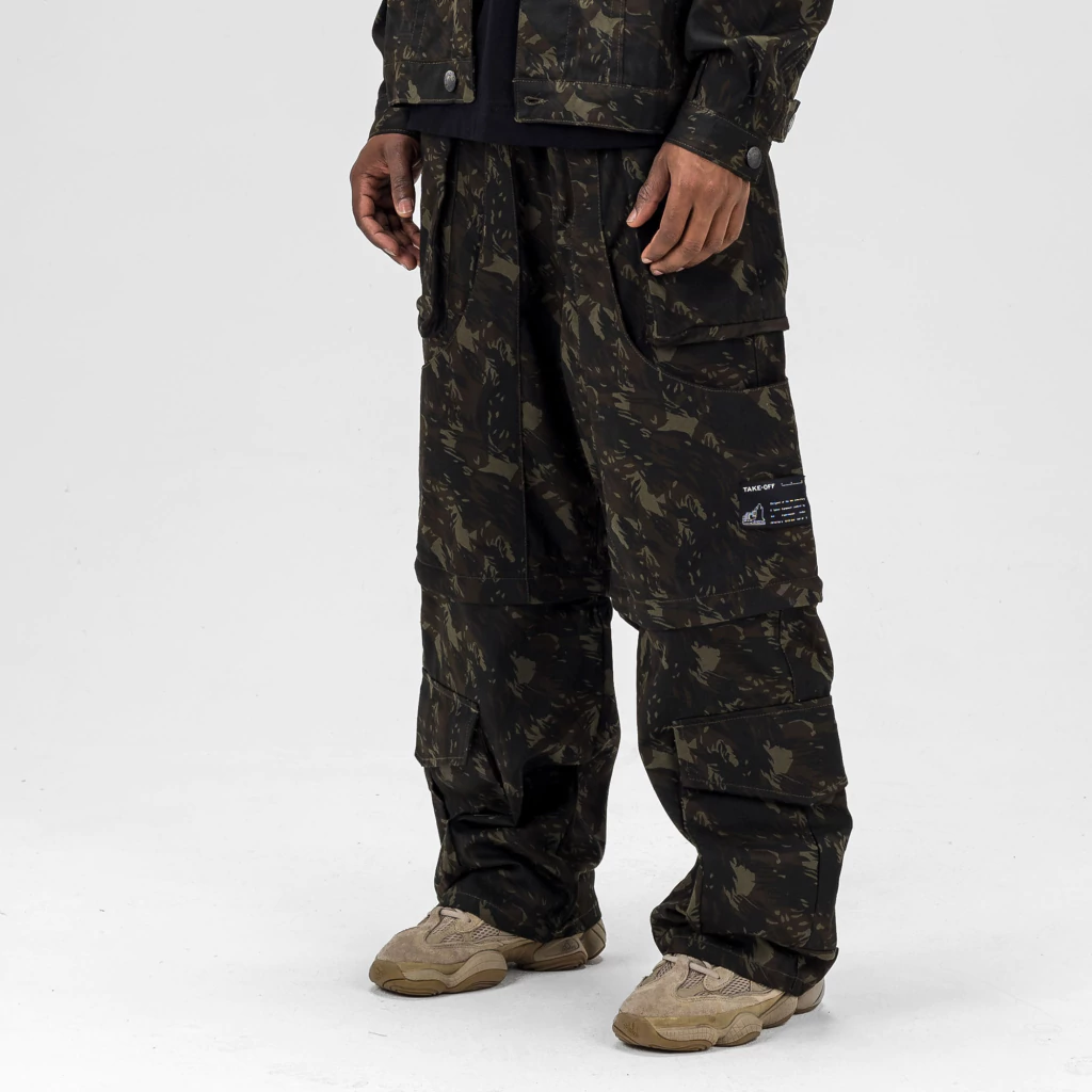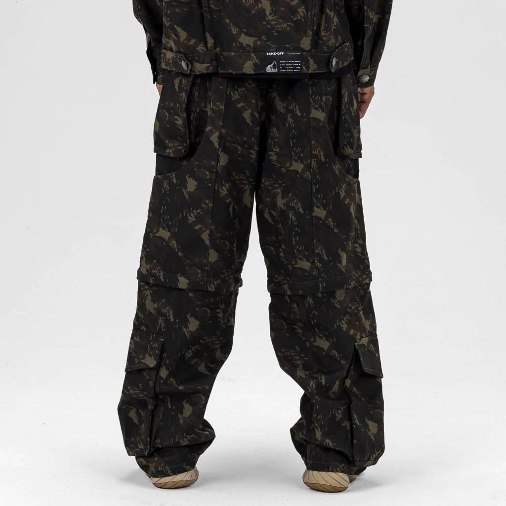 Peça pode ser usada tanto como uma calça baggy, como também em modelagem jorts. O ajuste é feito facilmente com um zíper. Produzida em sarja camuflada, tem vários bolsos, linhas em relevo e aplicação de tag externa.
