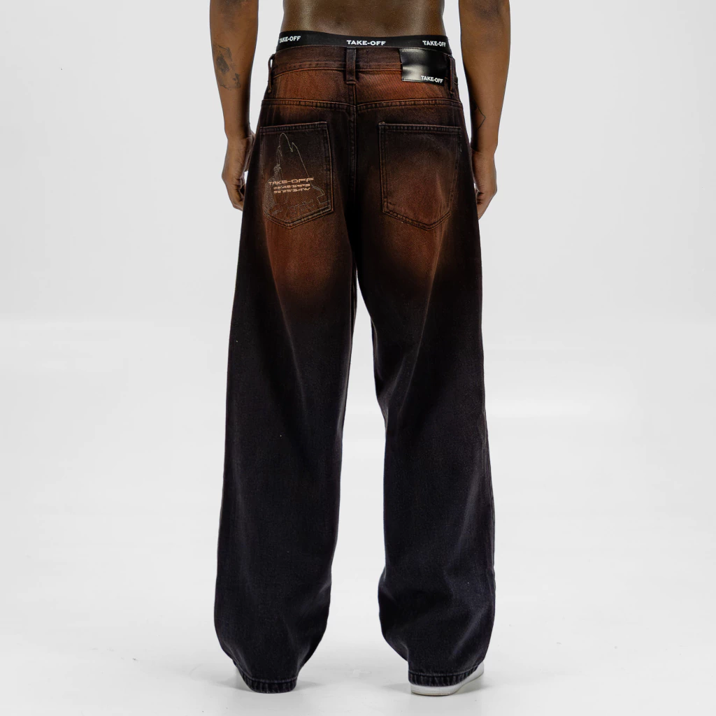 TKF-1OF1 OG Baggy Jeans conta com detalhe em laser na parte frontal, bordado em um dos bolsos e aplicação de tag externa em couro.