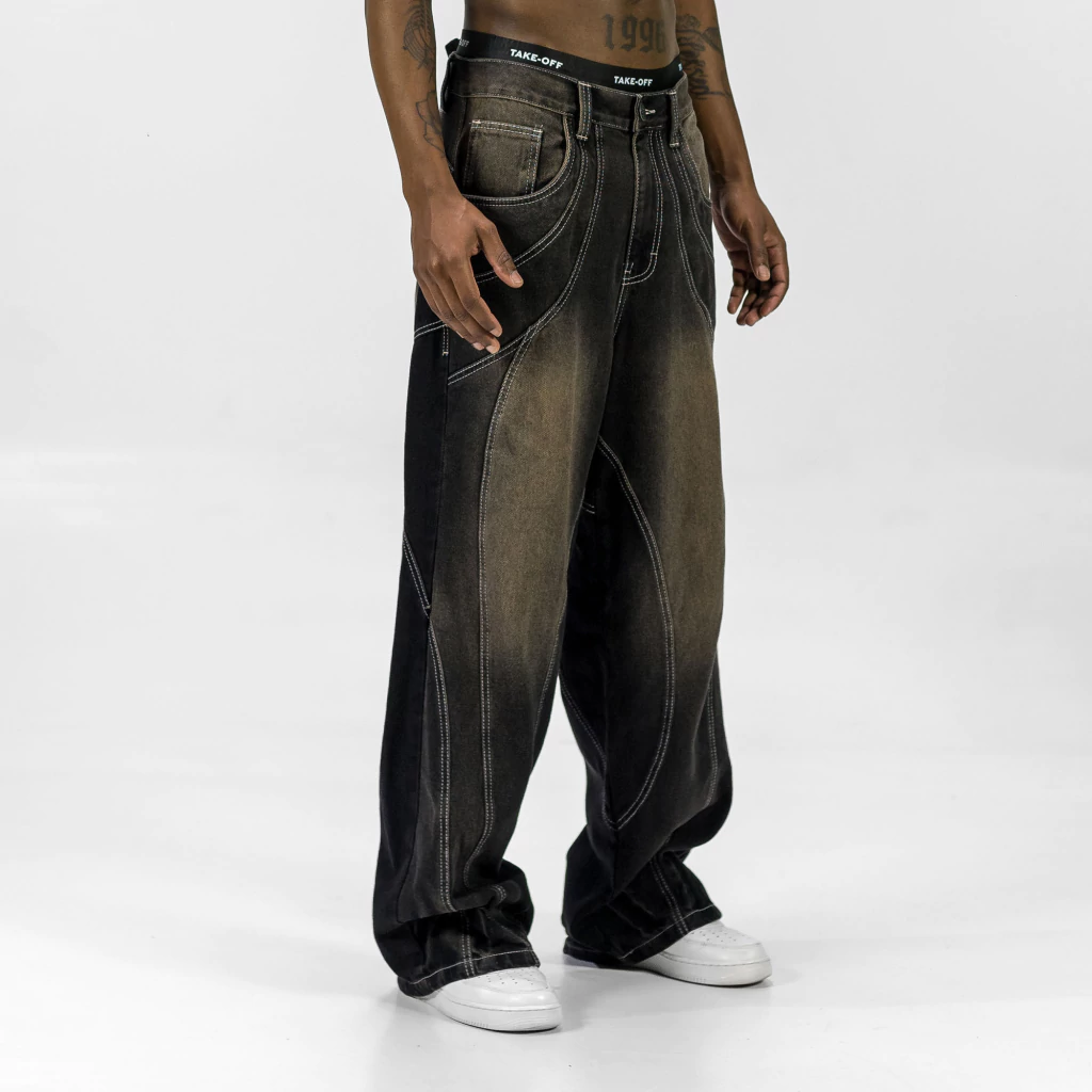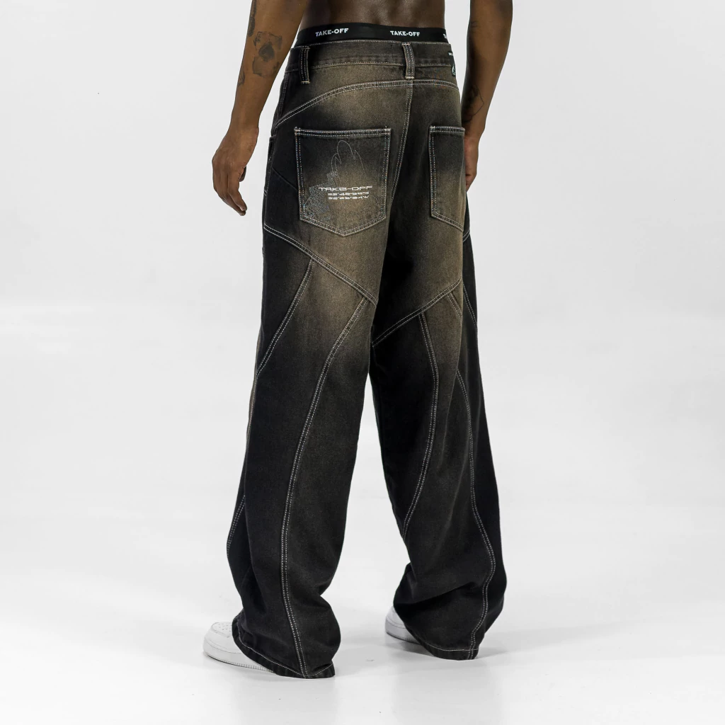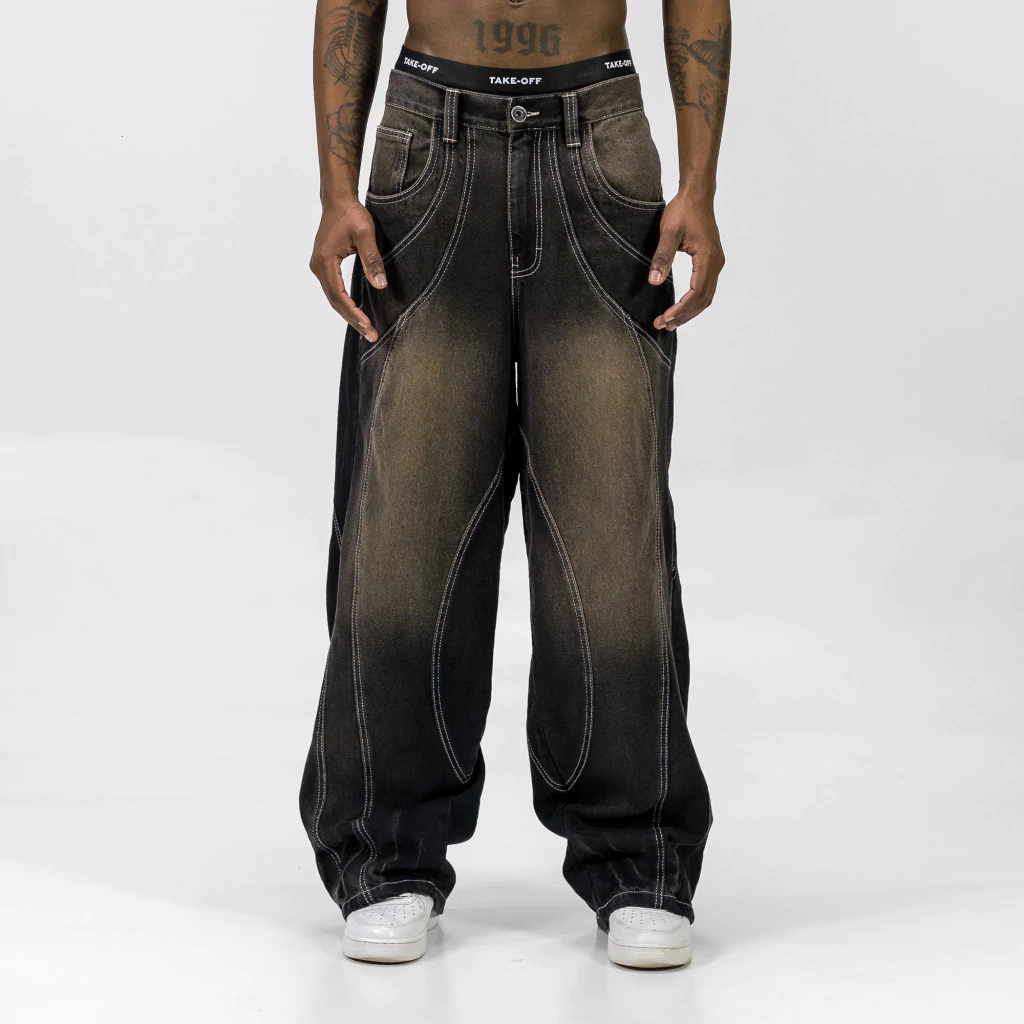 A TKF Baggy Disorder Washed Jeans conta com detalhes de costura em relevo ondulado em todo o entorno da calça, trazendo uma estética futurista e única pro produto.