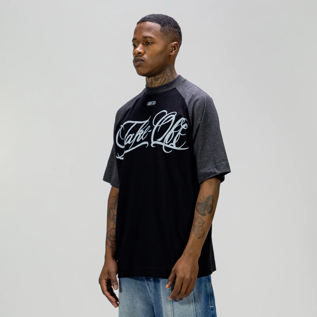 O material escolhido é um algodão que proporciona conforto e veste de forma fluída. A peça conta com corte raglan e junção de tecidos e cores.